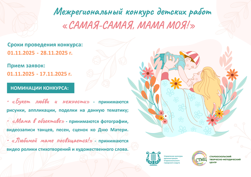 Приглашаем всех желающих принять участие в конкурсе творческих работ «Самая - самая, Мама моя!», посвящённом Дню матери! В последнее воскресенье ноября празднуется один из самых тёплых и душевных праздников в России – День матери. В этом году мы отмечаем его 26 ноября. Уже придумали, как хотите поздравить своих любимых мам? А это сделать необходимо, потому что мама – это самый важный в жизни человек, который всегда готов нас поддержать и подарить нам свою любовь. К участию в Конкурсе приглашаются обучающиеся образовательных учреждений (воспитанники дошкольных образовательных учреждений, центров дополнительного образования, учащиеся школ). Ссылка на заполнение заявки: https://forms.yandex.ru/u/653b63a7eb61464f9a4aba7a/ Конкурс проводится с 01 по 28 ноября 2025 года. Прием заявок: 01.11.2025-17.11.2025 года. С положением о порядке проведения конкурса можно ознакомиться подробнее по ссылке:https://tmc.oskol-kultura31.ru/media/site_platform_media/2025/10/13/konkursdetskogorisunkakodnyumateri.pdf