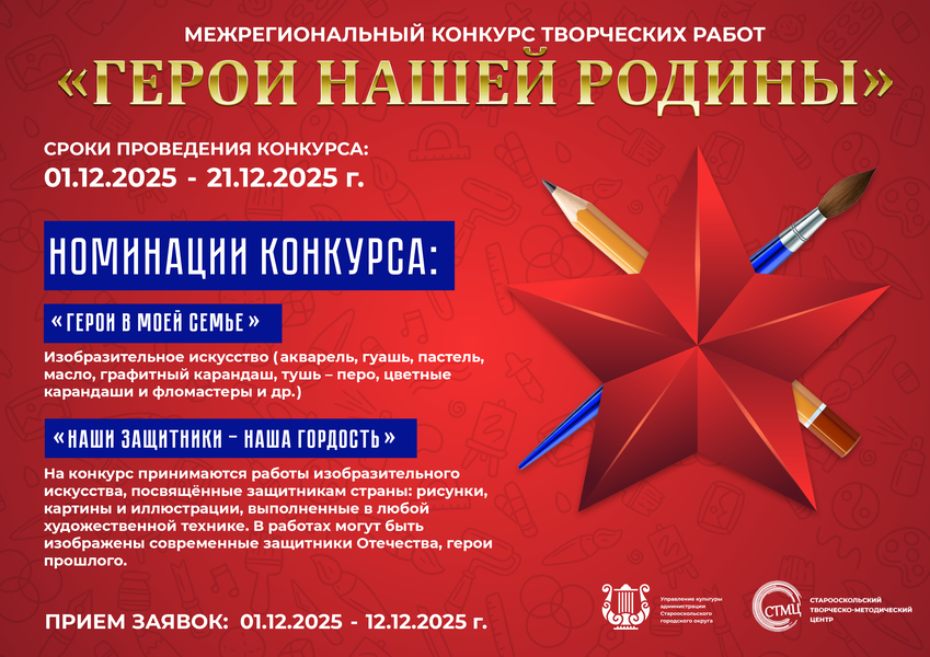 1 декабря начался прием заявок на участие в межрегиональном конкурсе творческих работ «Герои нашей Родины» К участию в Конкурсе приглашаются обучающиеся образовательных учреждений (воспитанники дошкольных образовательных учреждений, центров дополнительного образования, учащиеся школ). Конкурс проводится с 01 по 21 декабря 2025 года. Прием заявок: 01.12.2025-12.12.2025 года. С положением о порядке проведения конкурса можно ознакомиться подробнее по ссылке: https://tmc.oskol-kultura31.ru/vse-dokumenty/polozheniya-konkursov/polozhenie-o-poryadke-proved-geroi_nashei_Rodiny/ Ссылка на заполнение заявки: https://forms.yandex.ru/u/691adc9cf47e730017be6ce8
